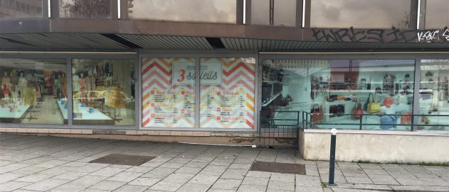 Cette pose a été réalisée avec de la vitrophanie en partie pour recouvrir la totalité des vitrines ou avec des bâches grand format sur les grilles de fermeture.